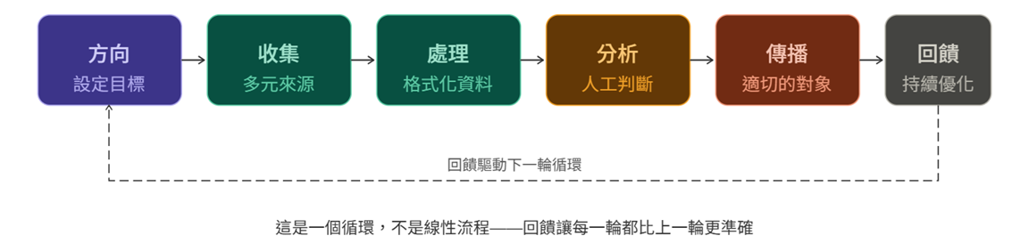 這些回饋,應該直接回流到第一步——調整下一輪情報循環的方向和需求。沒有持續回饋的情報計畫,只是在原地打轉;有了回饋機制,每一輪循環都會比上一輪更精準、更有價值。