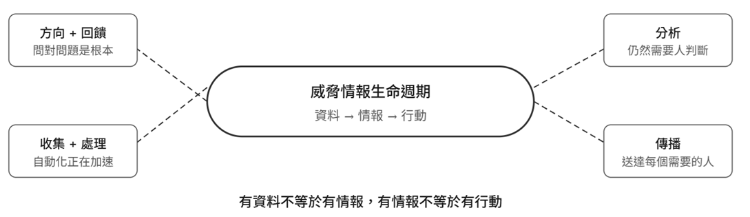 但有趣的是,框架中真正重要的環節——方向、分析、回饋——仍然高度依賴人的判斷。AI 可以幫你更快地把資料轉化成初步資訊,但「這個威脅對我們的業務意味著什麼?」這個問題,目前還是需要人來回答。