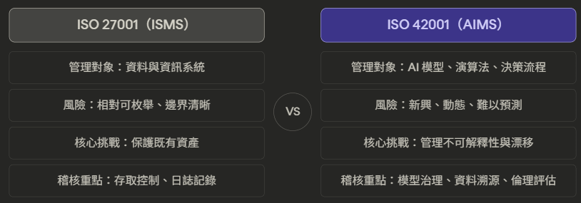 差異在哪裡?27001 管的是「資料在哪裡、誰能碰、資料流通、怎麼保護」,這些問題有相對確定的答案。但 42001 管的是 AI 系統(依照ISO 22989/23053定義,它是一組產品或服務的代名詞)。它的核心挑戰是不確定性——AI 模型的決策邏輯往往不透明,訓練資料的偏見可能在部署後才浮現,系統行為會隨資料分布改變而漂移。這意味著,AIMS 的稽核不能只看文件,必須真正理解組織的 AI 開發與部署流程。